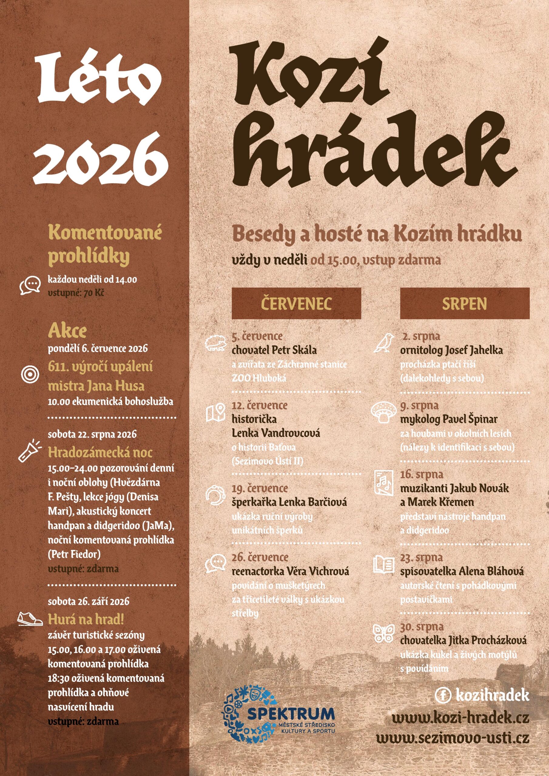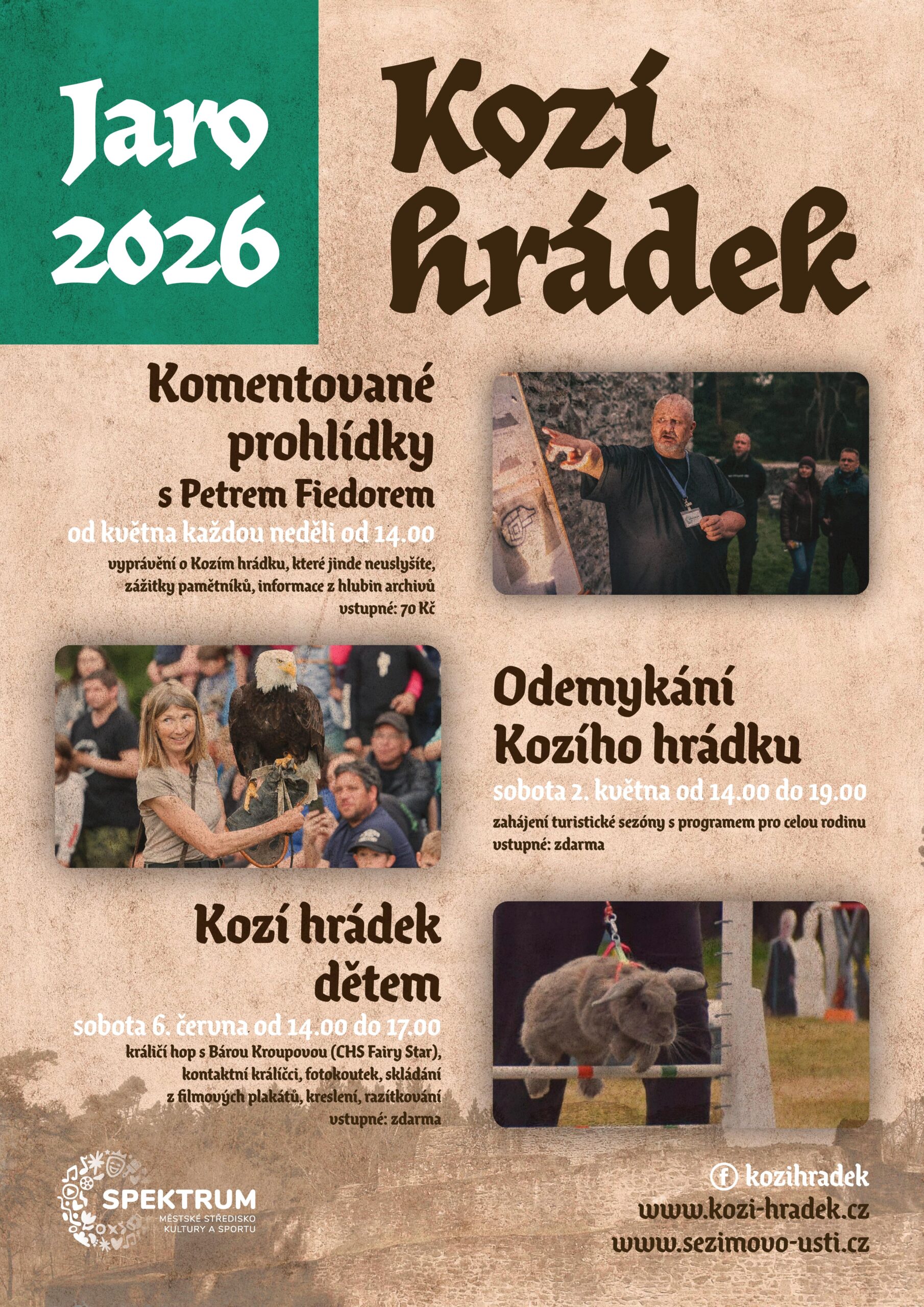 Sezónu pak zahájí v pátek 1. května 2026, tradiční akce u příležitosti otevření hradu „Odemykání Kozího hrádku“ se uskuteční v sobotu 2. května 2026.